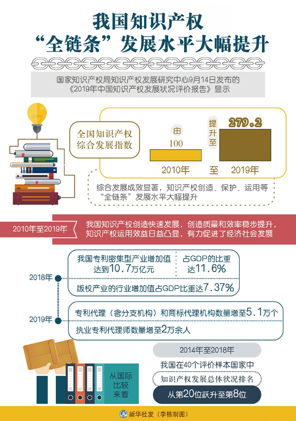 ——在完善法律法規(guī)方面,基本建立起符合國際通行規(guī)則、門類較為齊全的知識產(chǎn)權(quán)法律制度,實現(xiàn)了專利、商標、地理標志等知識產(chǎn)權(quán)的全方位、立體化保護。加入世貿(mào)組織以來,中國先后多次修訂專利法、商標法和著作權(quán)法等法律,基本形成了知識產(chǎn)權(quán)“嚴保護”的法律制度體系。